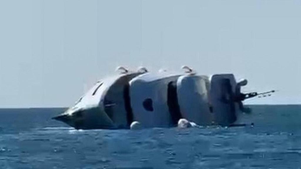 Footage shows the yacht tipping onto its side and sinking into the sea as those on board jump overboard in panic.