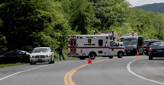 An ambulance pulls out onto Route 293 in Highlands, New York, near where a vehicle carrying USMA personnel crashed during a training exercise