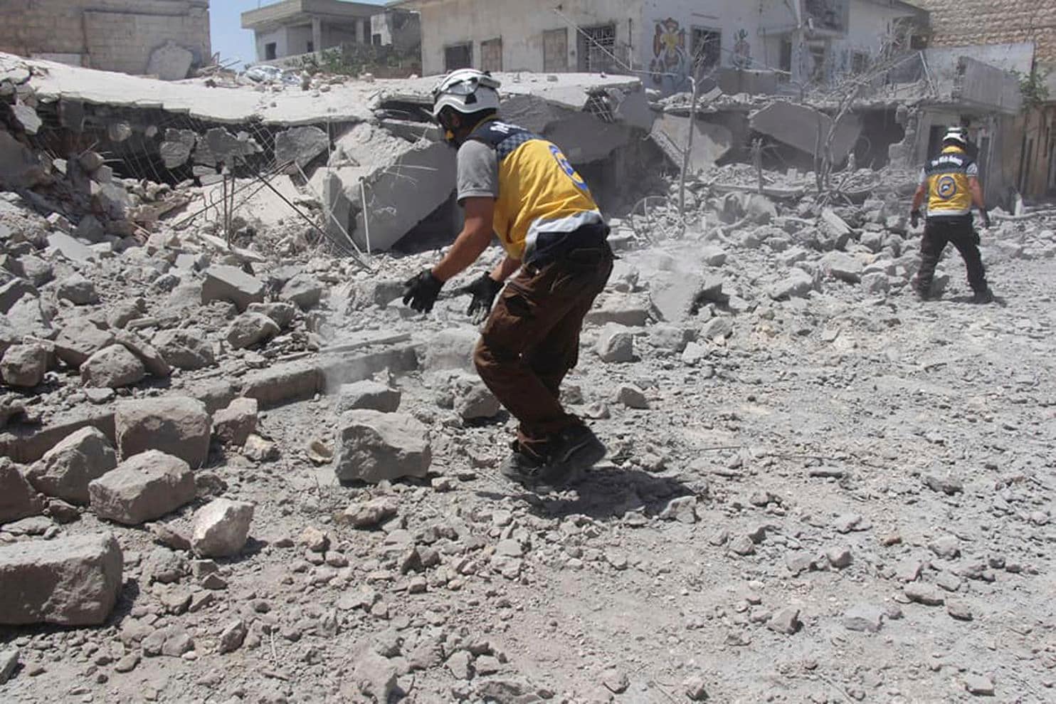 AP reporting, shows Civil Defense workers searching for victims under the rubble after an airstrike by Syrian government forces hit the village of Ehsim, in Jabal al-Zawiya, some 10 kilometers (6 miles) north of the town of Maarat al-Numan in Idlib, Syria, Monday, June 3, 2019.