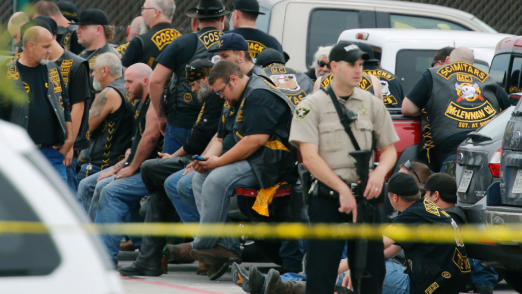 FILE – In this May 17, 2015 file photo, a McLennan County deputy stands guard near a group of bikers in the parking lot of the Twin Peaks restaurant in Waco, Texas.