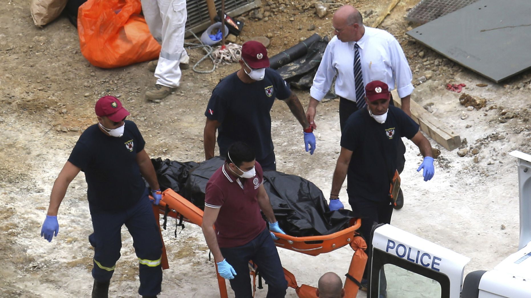Cyprus Special Disaster Response Unit investigators carry a covered suitcase on a stretcher after it was retrieved from a man-made lake near the village of Mitsero, outside of the capital Nicosia, Cyprus, Tuesday, June 4, 2019.  (AP)