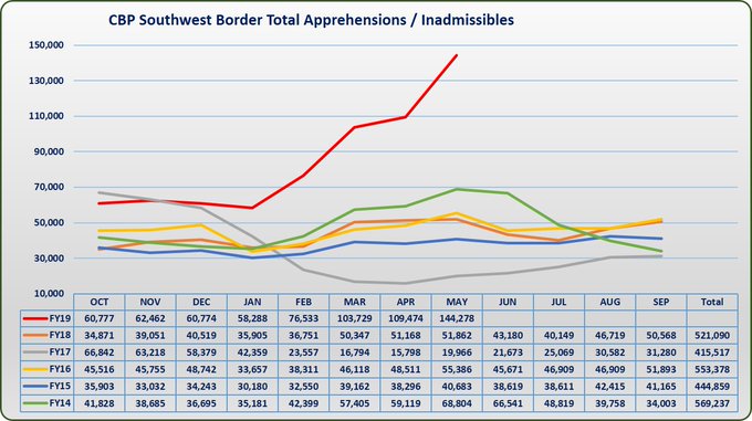 CBP apprehended or deemed inadmissible 144,278 individuals along the SWB—a 32% increase over the previous month.