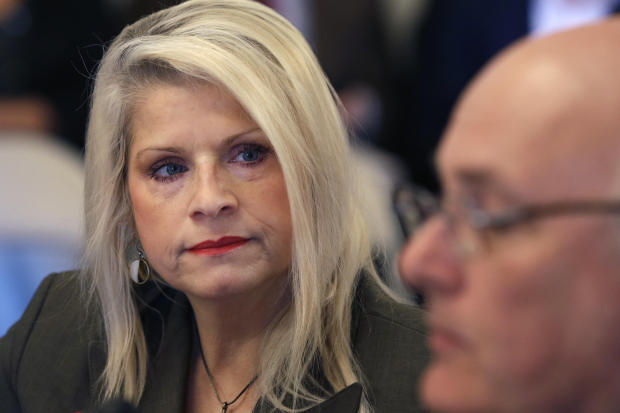 Sen. Linda Collins-Smith, R-Pocahontas, listens to testimony at a meeting of the Senate Committee on Public Health, Welfare, and Labor at the Arkansas state Capitol in Little Rock, Ark., Wednesday, Jan. 28, 2015. Legislators advanced Gov. Asa Hutchinson’s plan to continue Arkansas’ compromise Medicaid expansion through 2016, rejecting an effort to abolish the program later this year. (AP Photo/Danny Johnston)